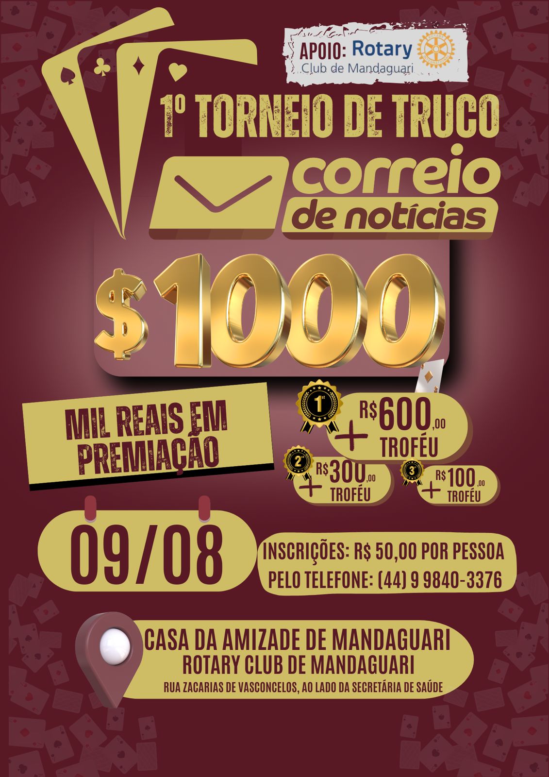 No dia 9 de agosto, véspera do Dia dos Pais, vai acontecer o 1º Torneio de Truco Correio de Notícias, a partir das 15h, na Casa da Amizade Rotary Club de Mandaguari, localizada na Rua Zacarias de Vasconcelos, ao lado da Secretaria de Saúde, com a maior premiação da categoria na região, R$ 1.000,00 (mil reais) mais troféus. O evento faz parte das comemorações dos 10 anos do Correio de Notícias.
