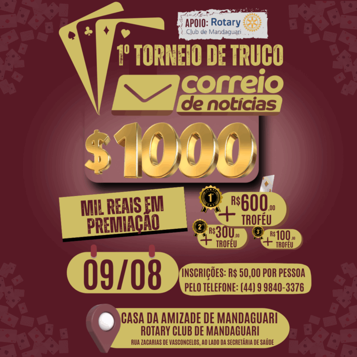 No dia 9 de agosto, véspera do Dia dos Pais, será realizado o 1º Torneio de Truco Correio de Notícias, a partir das 15h, na Casa da Amizade do Rotary Club de Mandaguari, localizada na Rua Zacarias de Vasconcelos, ao lado da Secretaria de Saúde.