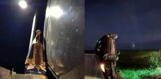 Carro capota e para aos pés de imagem de Nossa Senhora...