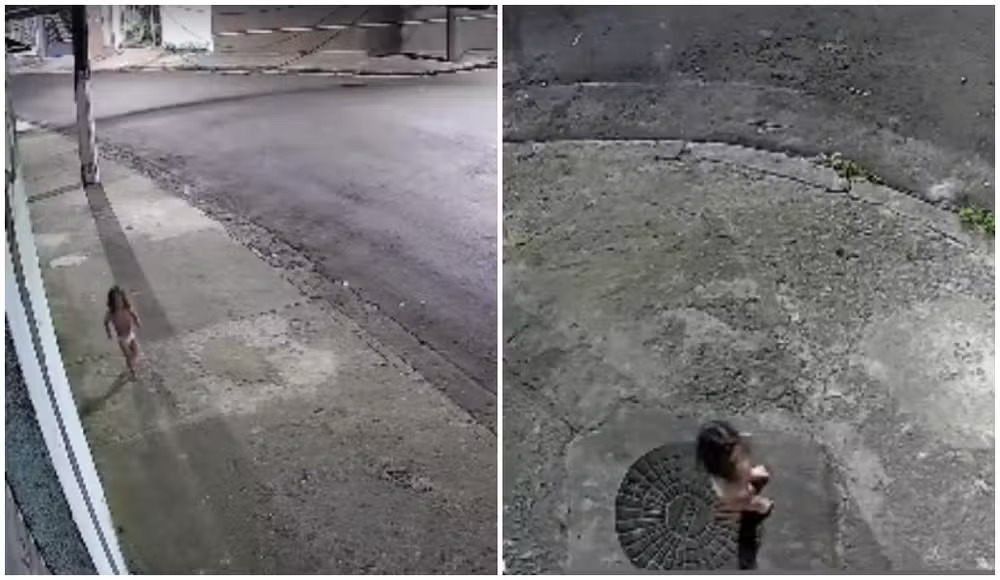 Câmeras de segurança registraram o momento em que a menina caminha sozinha descalça pela Rua Pero Vaz vestindo apenas uma fralda. Nas imagens, a menina aparece chorando e chamando pela mãe, uma estudante de 19 anos.