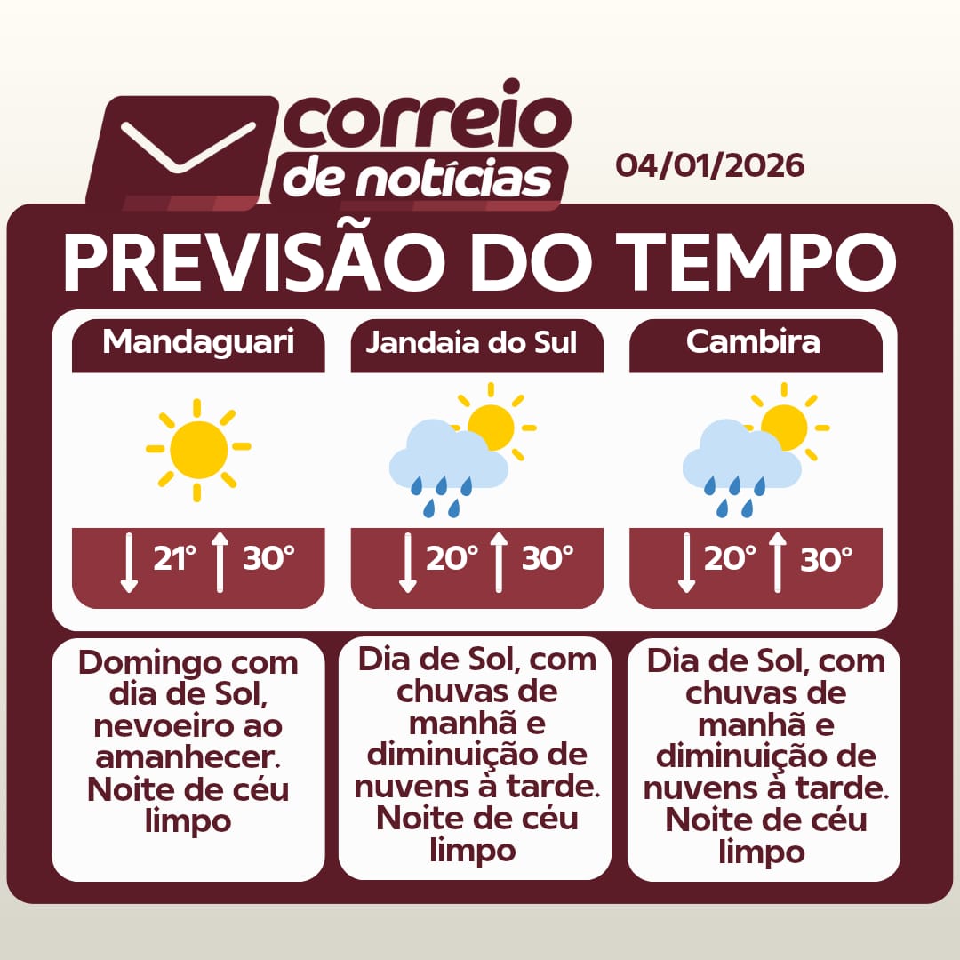 Já em Jandaia do Sul, o domingo começa com chuvas pela manhã, seguidas de diminuição das nuvens à tarde. A mínima prevista é de 20 °C e a máxima chega aos 30 °C. À noite, o tempo fica estável, com céu limpo.