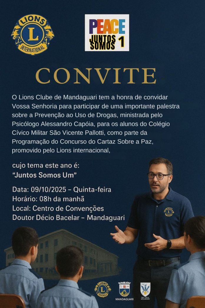 O Lions Clube de Mandaguari promove, nesta quinta-feira (9), uma palestra sobre prevenção ao uso de drogas, voltada aos alunos do Colégio Cívico Militar São Vicente Pallotti. A atividade será conduzida pelo psicólogo Alessandro Capóia e integra a programação do tradicional Concurso do Cartaz Sobre a Paz, iniciativa internacional do Lions que busca estimular a reflexão sobre valores humanos e convivência harmônica.