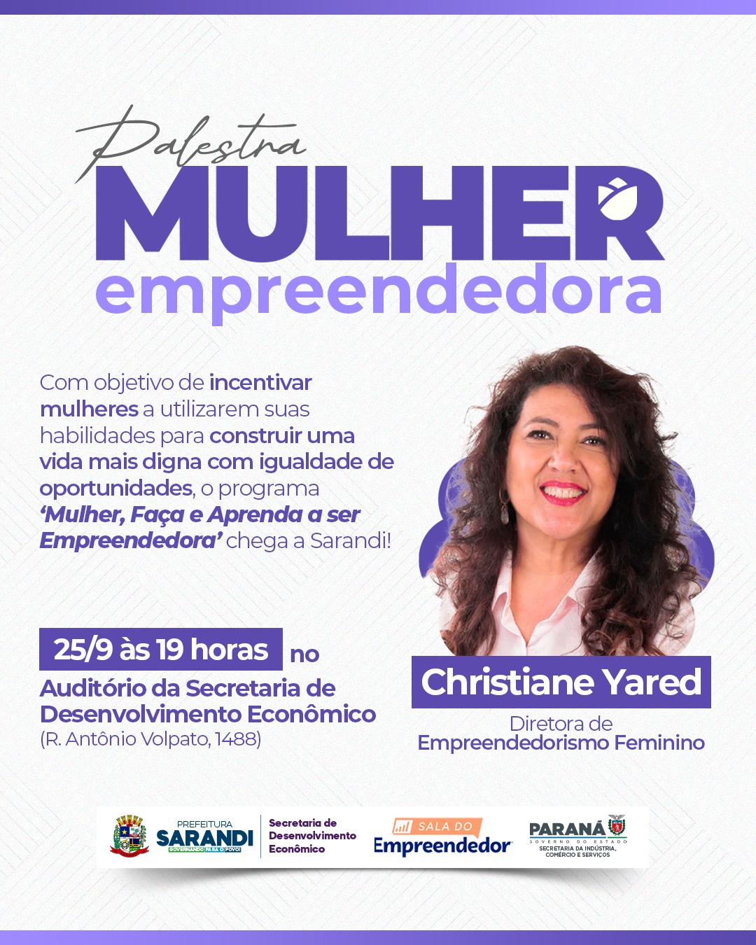 Uma palestra que promete ser mais que um encontro de capacitação: um movimento de inspiração. Nesta quarta-feira (25), às 19h, o auditório da Secretaria de Desenvolvimento Econômico recebe o programa “Mulher, Faça e Aprenda a ser Empreendedora”, com a participação de Christiane Yared, diretora de Empreendedorismo Feminino.